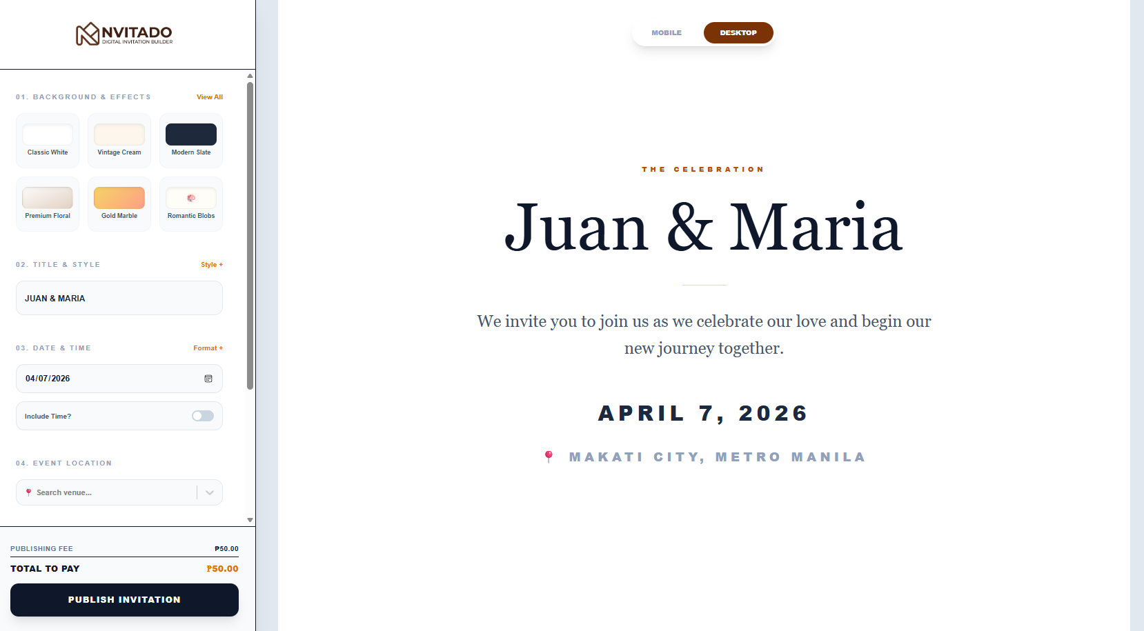 Create breathtaking digital invitations in minutes. Secure your custom nvitado.com link instantly with our intuitive builder.
